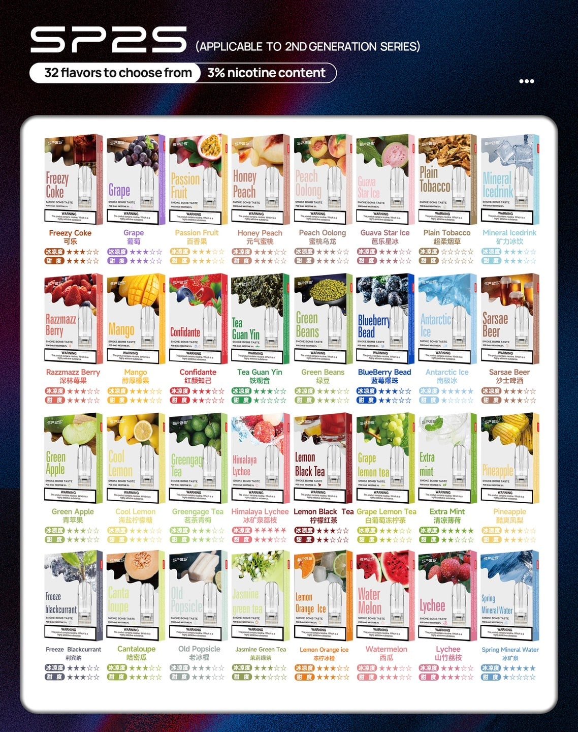 SP2S煙彈以其通用性強、口味豐富、品質保證和價格親民的優勢,成為許多電子煙愛好者的首選。不論你是電子煙新手還是老玩家,SP2S 煙彈都能為你帶來全新的電子煙體驗,讓你享受每一口煙霧的獨特魅力。